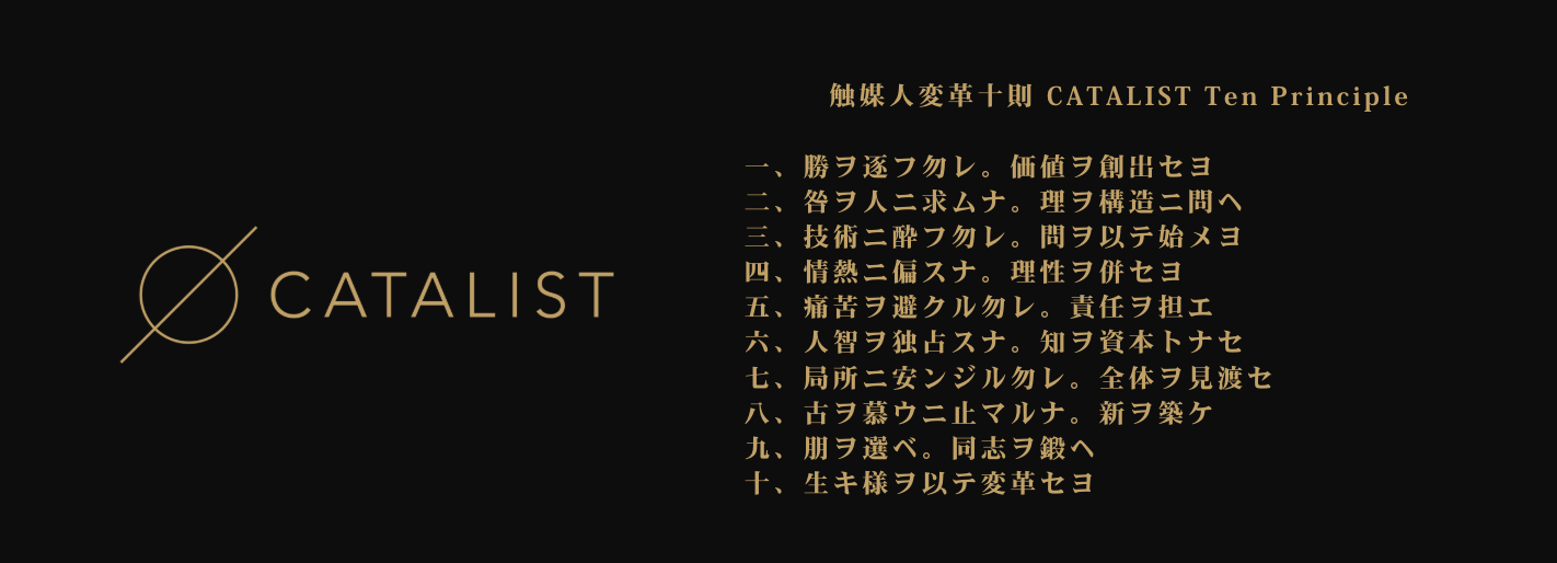 だからこそ、理念よりも深いところにある「生き方の規範」を、具体的に明文化する必要がありました。その答えとして生まれたのが,「触媒人変革十則: CATALIST.Ten Principles|Be the Catalyst of Transformation」です。