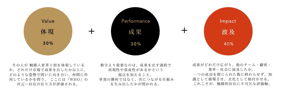 私は、触媒人変革十則を「生き方の規範」として掲げただけでは不十分だと考えました。それを評価と報酬に直結させることで初めて、思想は制度に刻まれ、制度は文化を育む。この循環をつくるために設計したのが、VPI制度です。